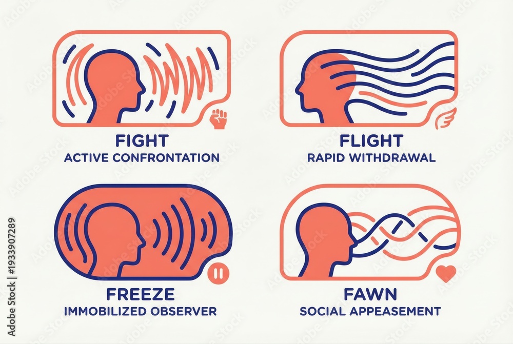 Visual Representation of Human Responses in Crisis Mode Including Fight Flight Freeze and Fawn Mechanisms Highlighting Impacts on Behavior and Emotions