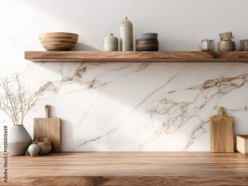 Minimalist Kitchen Shelf With Wooden Planks Marble Wall Wallpaper Mural - Decorly Solutions | Decorly Solutions