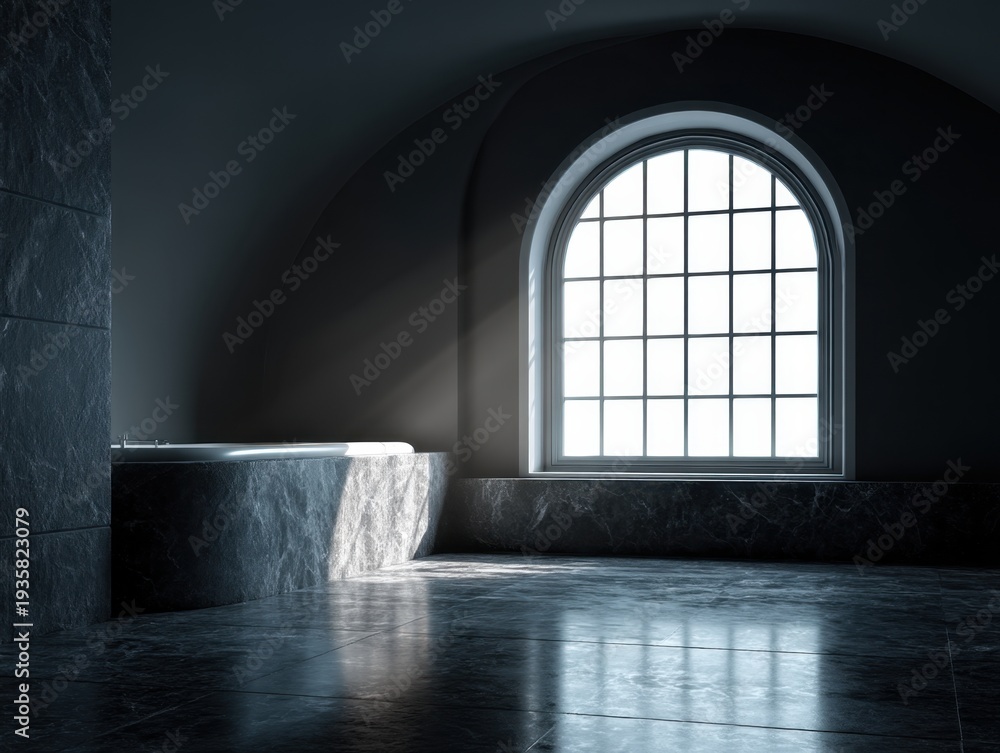 Dark stone room with arched window Sunlight streams through Wallpaper