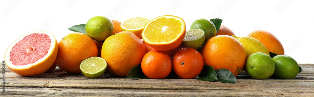 Different Ripe Citrus Fruits On Wooden Table Against Wallpaper Mural - Decorly Solutions | Decorly Solutions