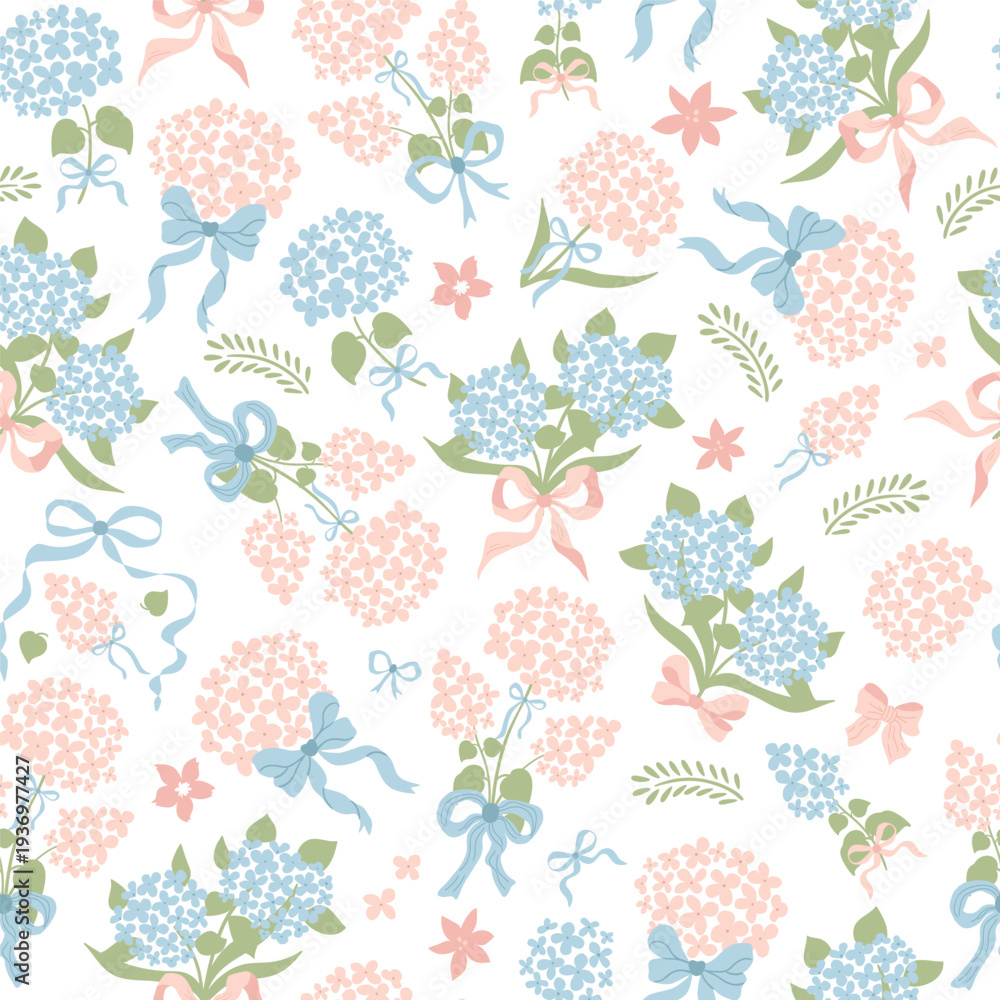 Grandmillennial Hydrangea Bows Ribbons Seamless Pattern In Hand-drawn Wallpaper Mural - Decorly Solutions | Decorly Solutions