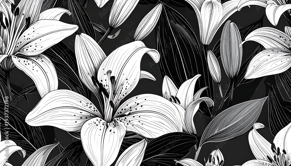 Monochrome Floral Arrangement Lilies & Leaves Repeat In Wallpaper Mural - Decorly Solutions | Decorly Solutions