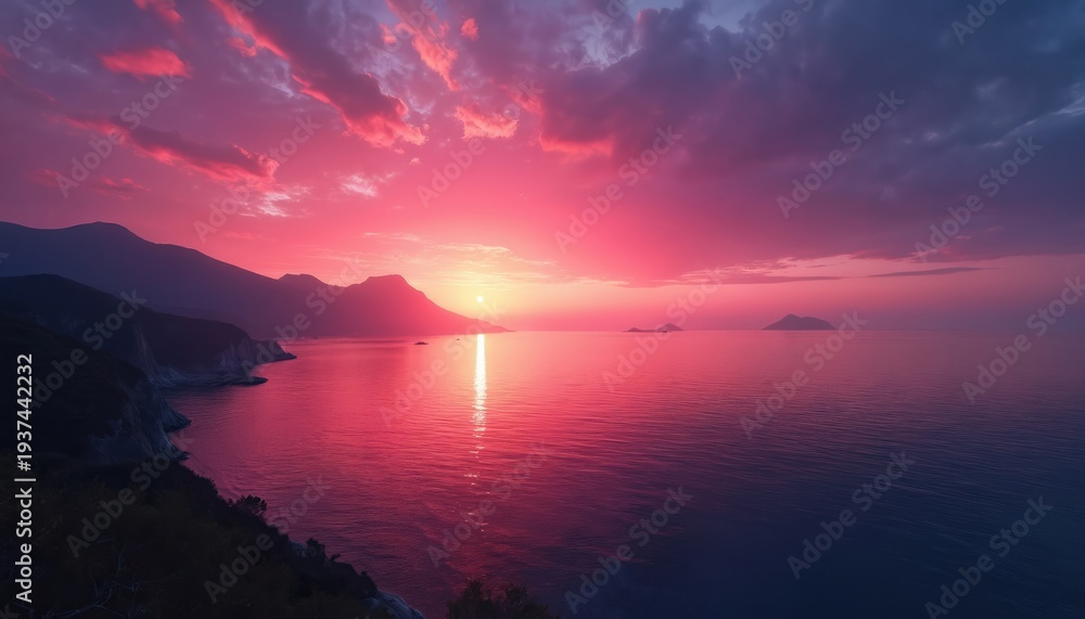Purple and pink sunset over calm ocean and rocky coastline S Wallpaper