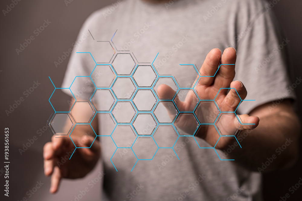 Close-up of a person interacting with a futuristic digital hexagon network. Perfect for technology and innovation concep