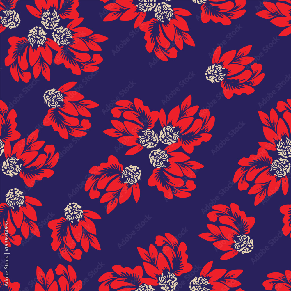 Seamless floral vector pattern with bold coral and pink blossoms, leafy stems and decorative sprigs on a deep blue background. Elegant botanical design for textiles and prints