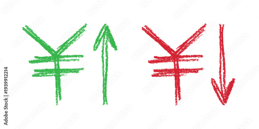 Hand Drawn Won Currency Symbol Growth And Fall Profit With Arrow Up And Down Brush Stroke Doodle Element For Design