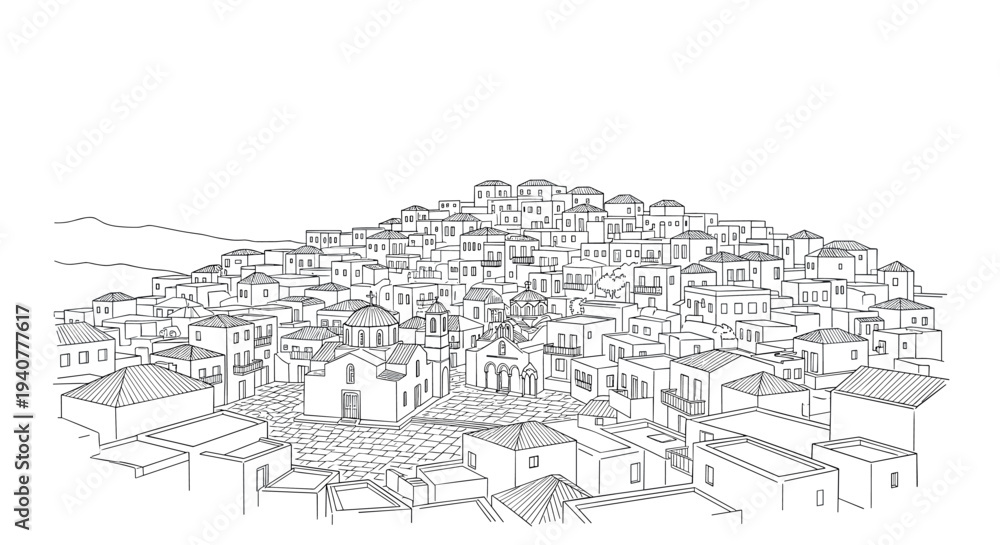 Hand Drawn Greek Village Architecture With Traditional White Wallpaper Mural - Decorly Solutions | Decorly Solutions