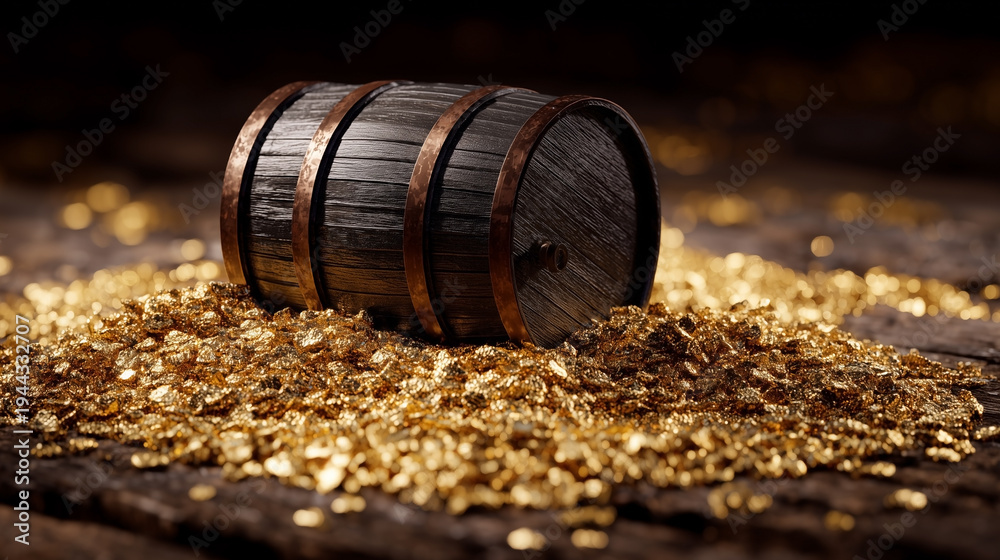 Overflowing Wooden Barrel Of Gold Coins And Bullion With Blurred Bokeh Background, Wealth And Investment Concept.