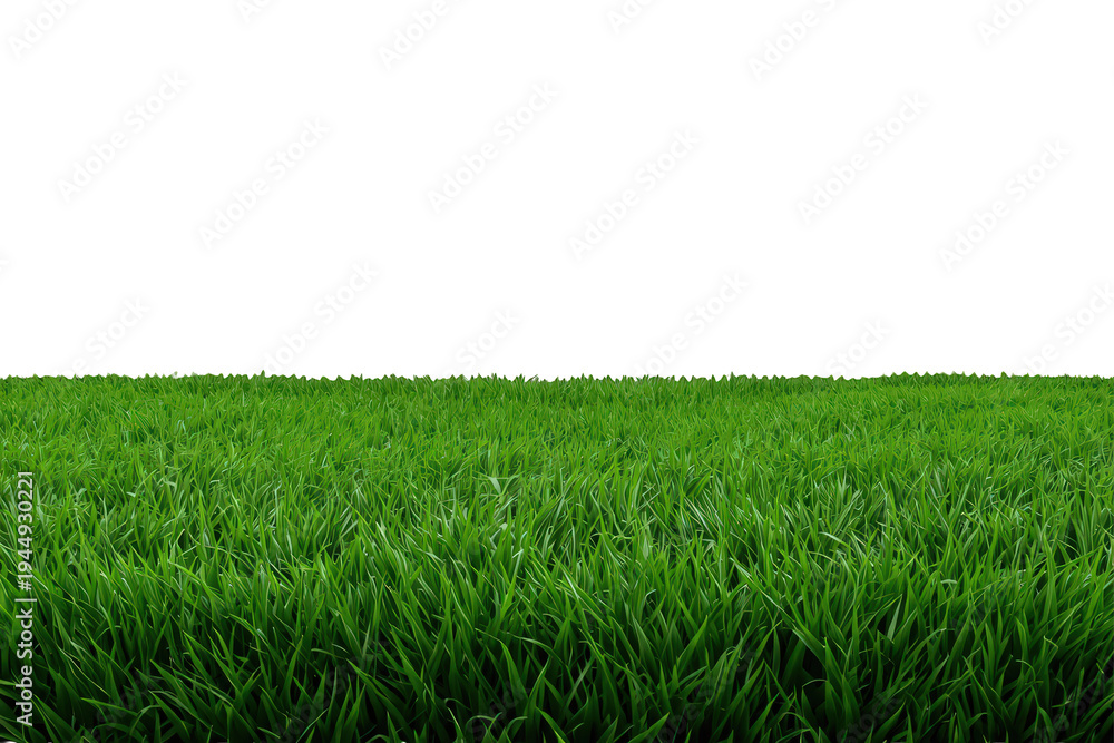 A lush, verdant expanse of green grass stretches across the lower portion of the frame against a stark, white backdrop