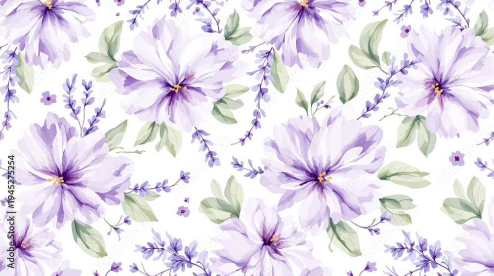 A delicate floral pattern featuring soft purple blooms and greenery, perfect for adding a touch of elegance to any design.