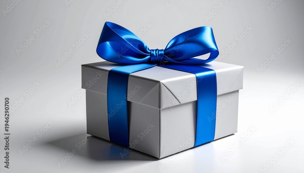 A simple yet elegant white gift box adorned with a vibrant blue satin ribbon and bow, isolated on a light background for any celebration.