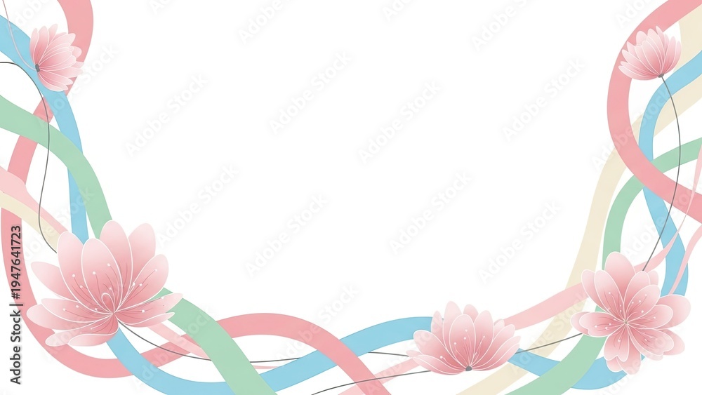 Elegant Pink Floral Frame with Pastel Wavy Ribbons on White Wallpaper
