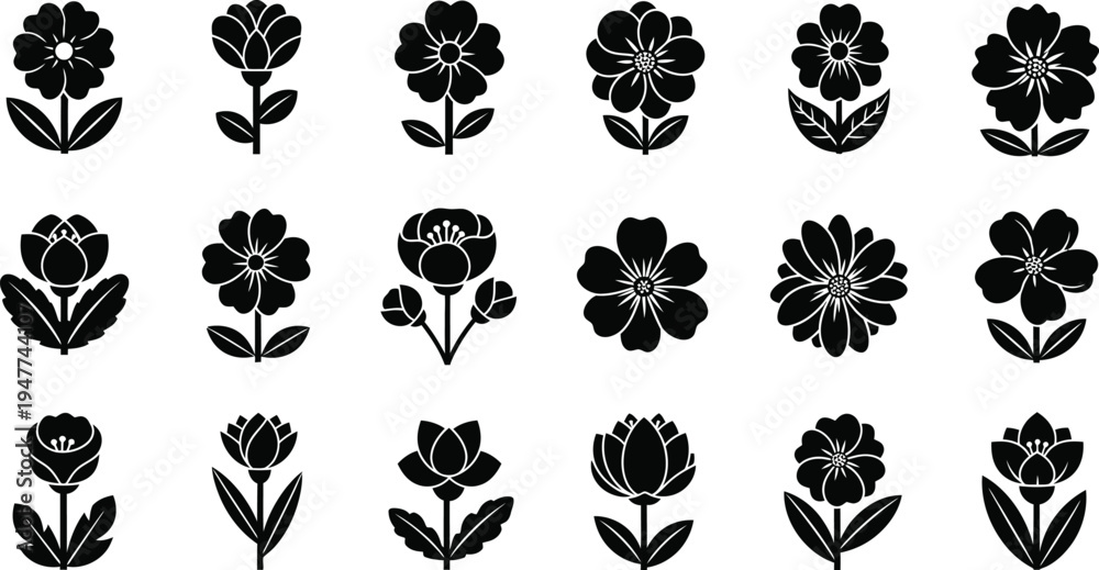 Minimal black floral icon set top view multiple rose tulip daisy lotus silhouettes arranged in neat grid for vector svg png mockup presentation with crisp contrast