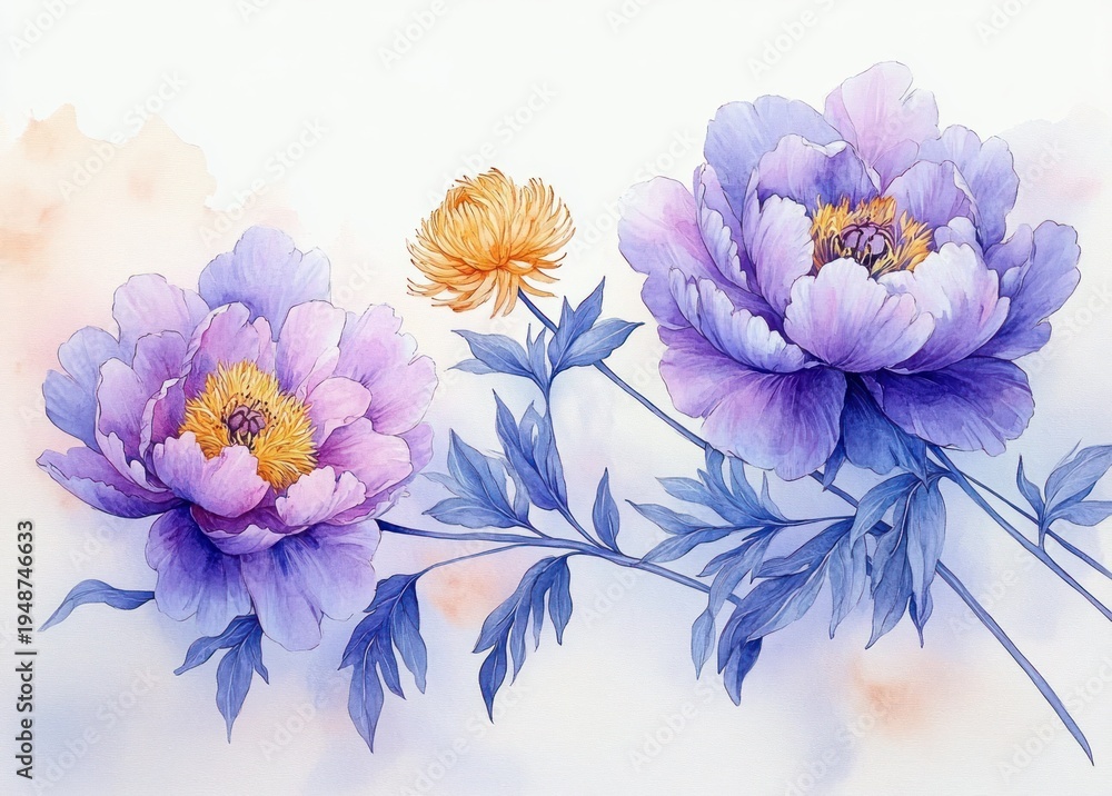 Delicate watercolor of two large purple peonies and a golden chrysanthemum on graceful stems with soft pastel background, evoking serenity and gentle elegance