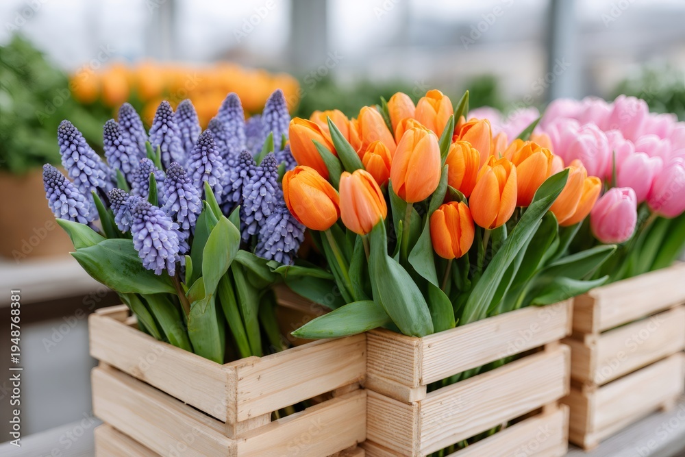 Colorful potted spring flowers displaying on wooden crates