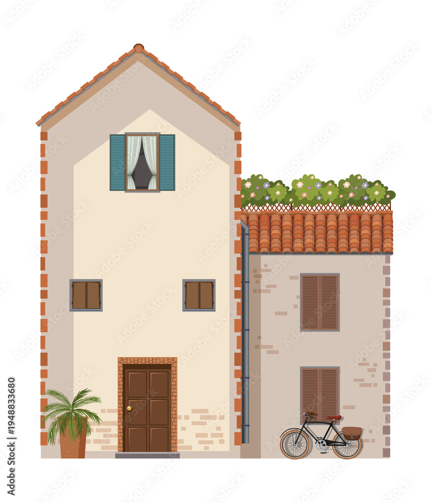A house with a bicycle parked outside and a potted plant tra Wallpaper