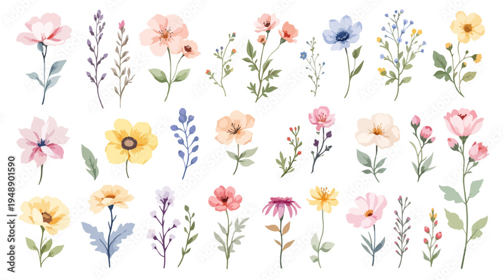 Collection of flat-style floral illustrations: pink, yellow, orange, and purple flowers, leaves