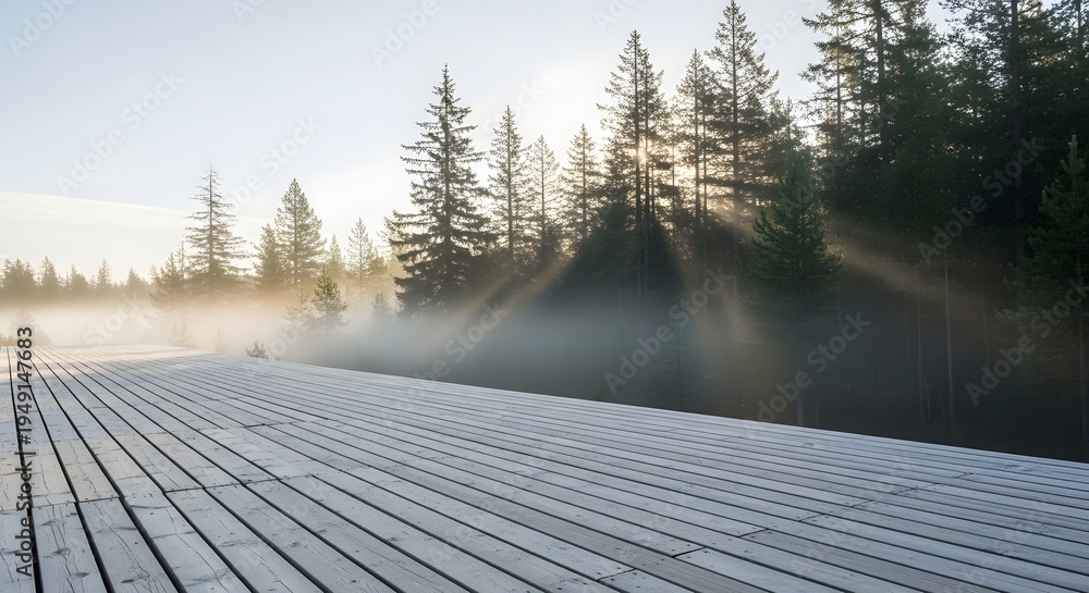 Serene wooden deck with empty bench overlooking misty forest sunrise with sunbeams breaking through the fog creating a tranquil and peaceful atmosphere