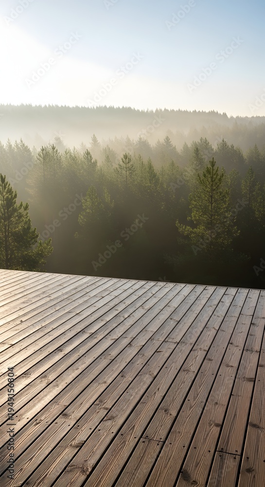 Wooden Deck Overlooking A Misty Pine Forest At Wallpaper Mural - Decorly Solutions | Decorly Solutions