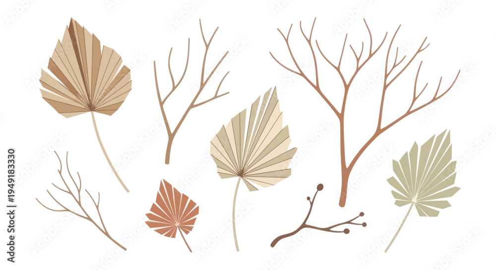 Dried Palm Leaf And Dried Curly Leaf With Branches, Flat Design