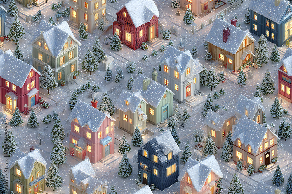 Winter village with snow covered houses and pine trees under streetlights, creating cozy festive atmosphere in seamless isometric pattern