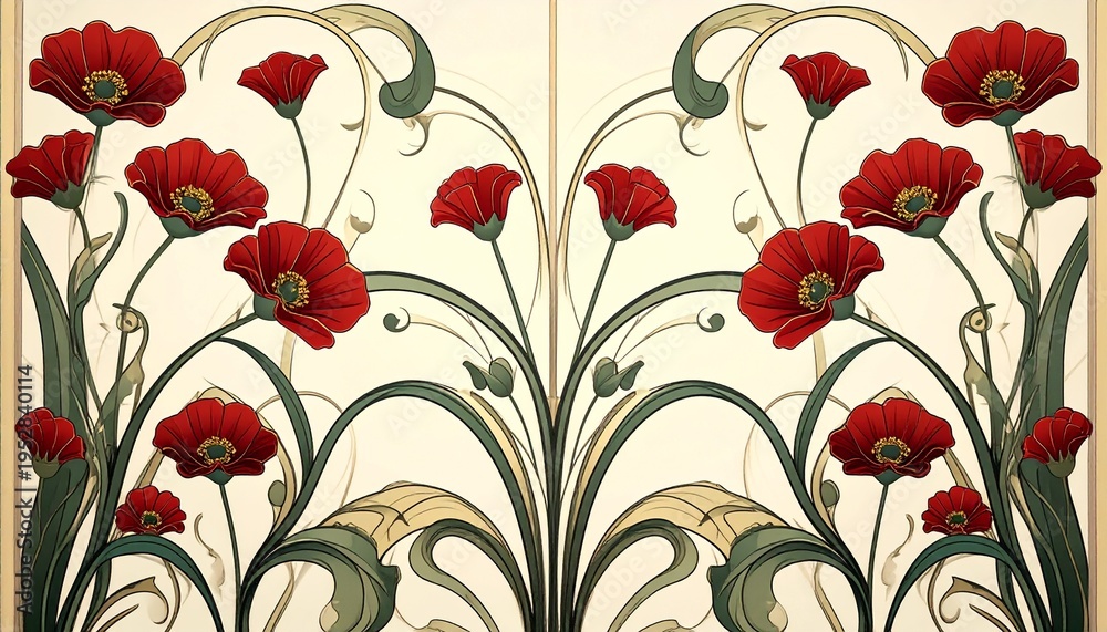 Decorative Red Poppies in Art Nouveau Style Featuring Symmet Wallpaper