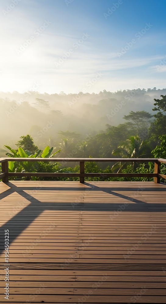Wooden Deck Overlooking A Misty Tropical Jungle Landscape Wallpaper Mural - Decorly Solutions | Decorly Solutions