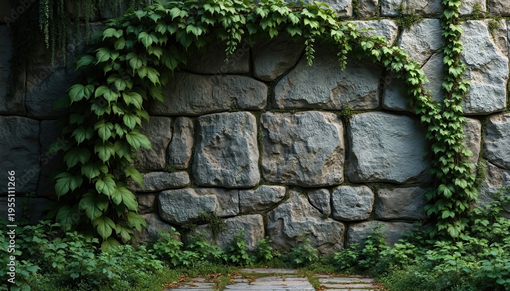 Old Stone Wall Overgrown With Green Vines And Wallpaper Mural - Decorly Solutions | Decorly Solutions