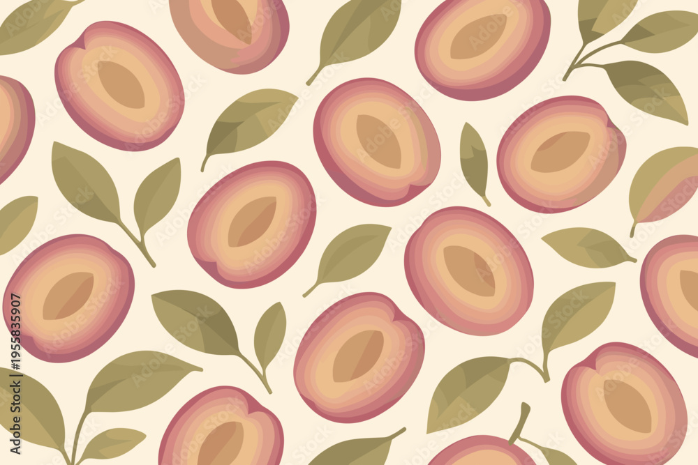 Fruit pattern design with plums and leaves on a light backgr Wallpaper