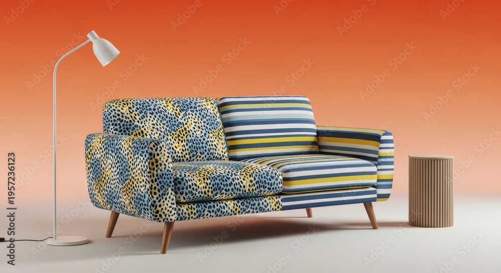 Vibrant patterned sofa paired with a modern floor lamp in a Wallpaper