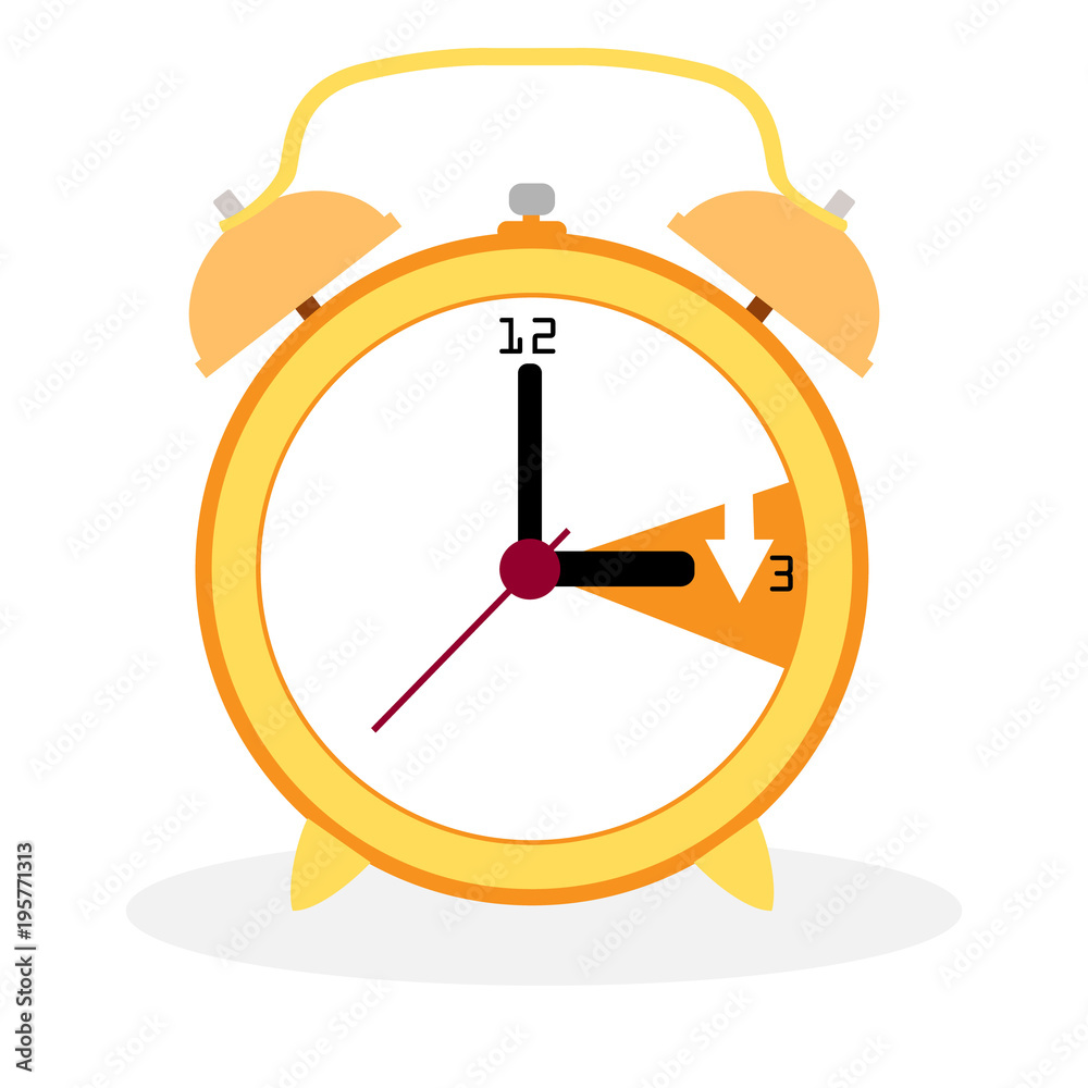 Retro alarm clock face with red frame and yellow bells, illustration of a vintage timepiece with blue dial and black hands marking the hour, perfect for concept of time management or waking up