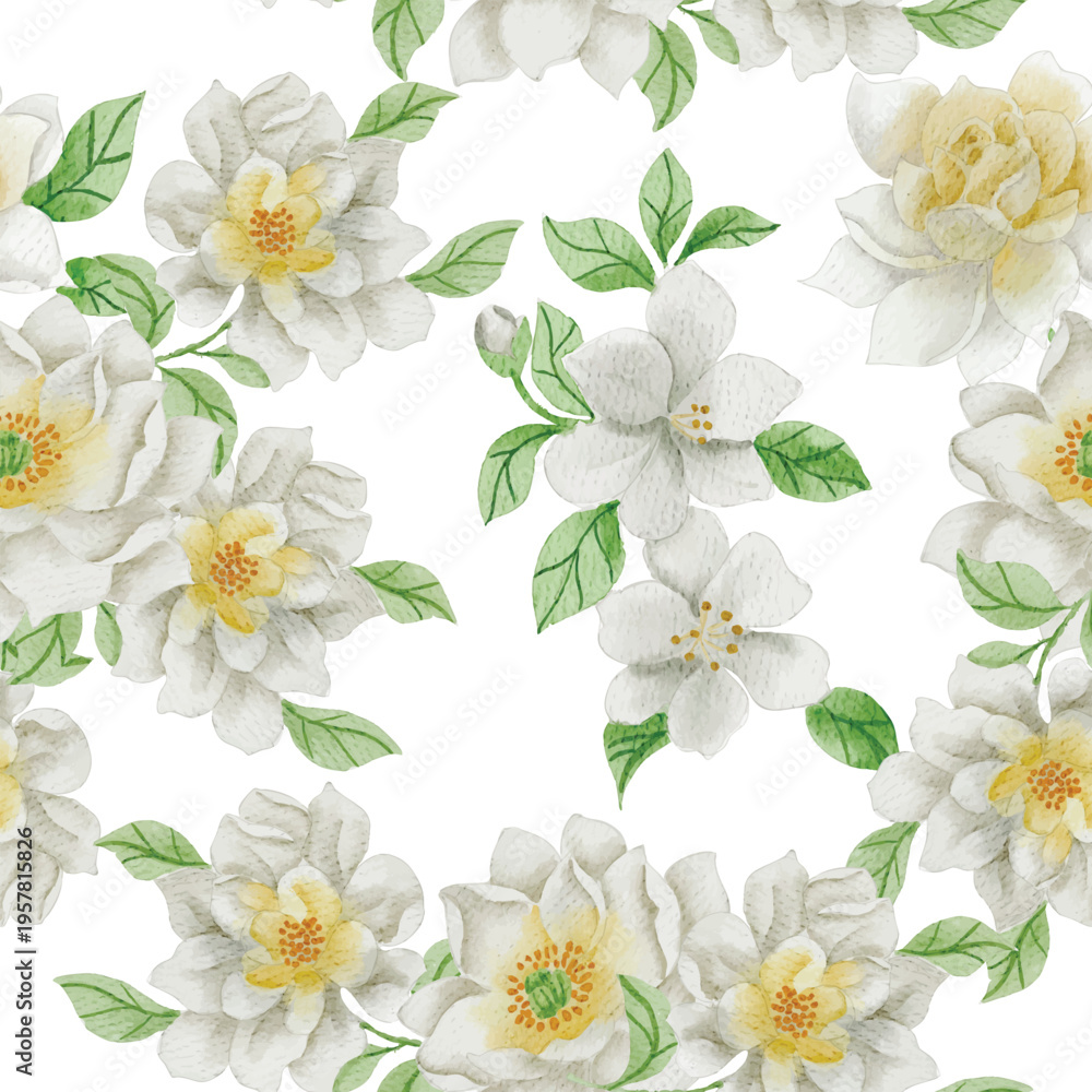 White Magnolia and Jasmine Watercolor Seamless pattern Wallpaper