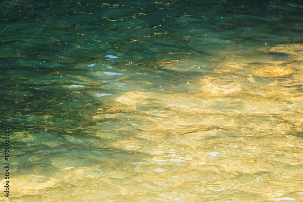 Clean transparent sea water, lake bottom and sand. Beautiful blue, turquoise transparent surface