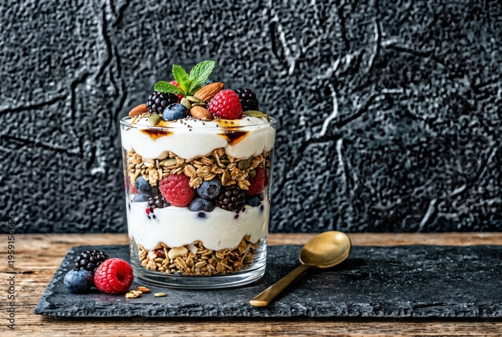 Fresh yogurt parfait layered with granola, strawberries, blueberries, raspberries and mint leaves showcasing healthy lifestyle choices and vibrant culinary aesthetics