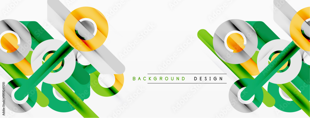 Abstract lines, vibrant colors, modern design elements. Composition features overlapping shapes, dynamic visual impact. Background includes text label.