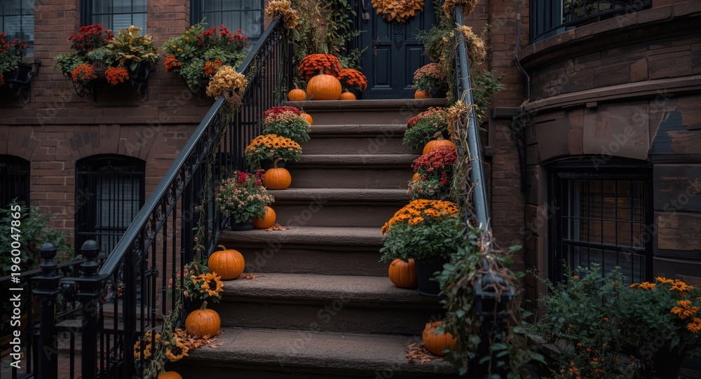 Fall Decorated Brownstone Stairway With Vibrant Flowers And Wallpaper Mural - Decorly Solutions | Decorly Solutions