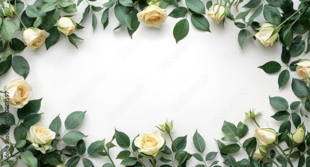 Green leaves and damask roses floral border flat lay backgro Wallpaper