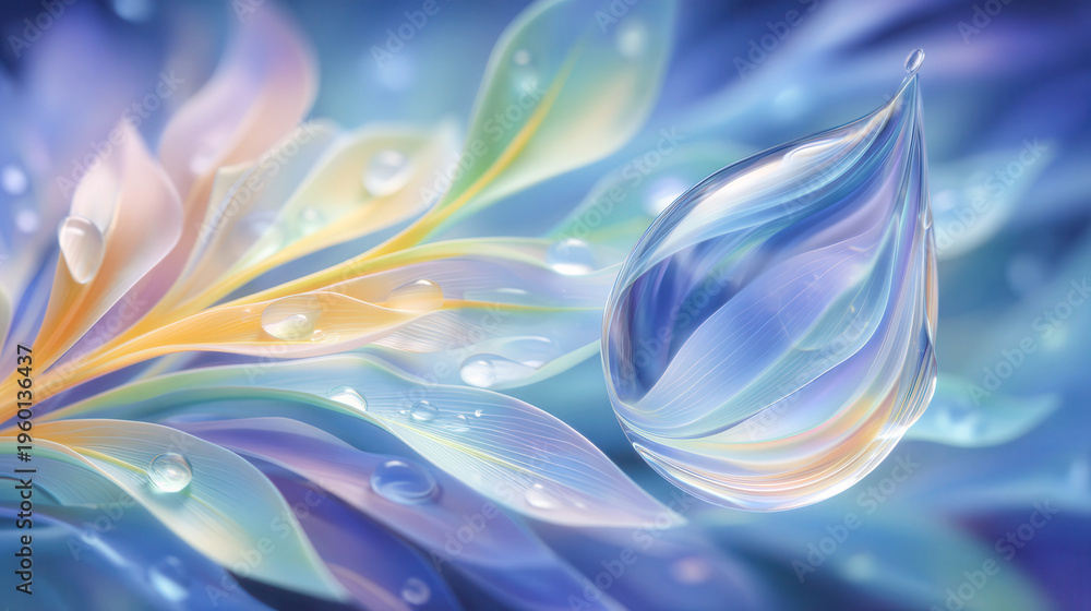 Soft water droplet floats beside glowing petals Pastel hues Wallpaper