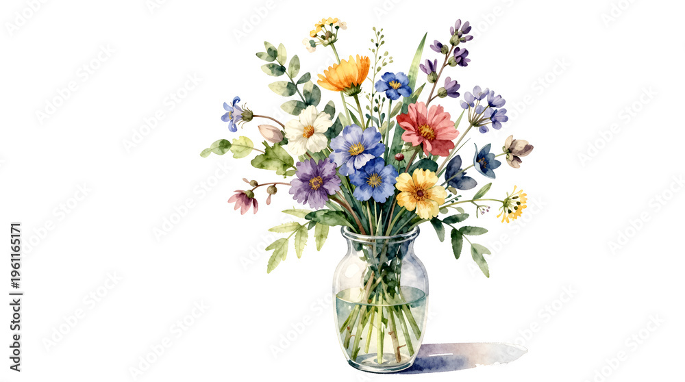 Watercolor illustration of a field flower bouquet in a clear Wallpaper