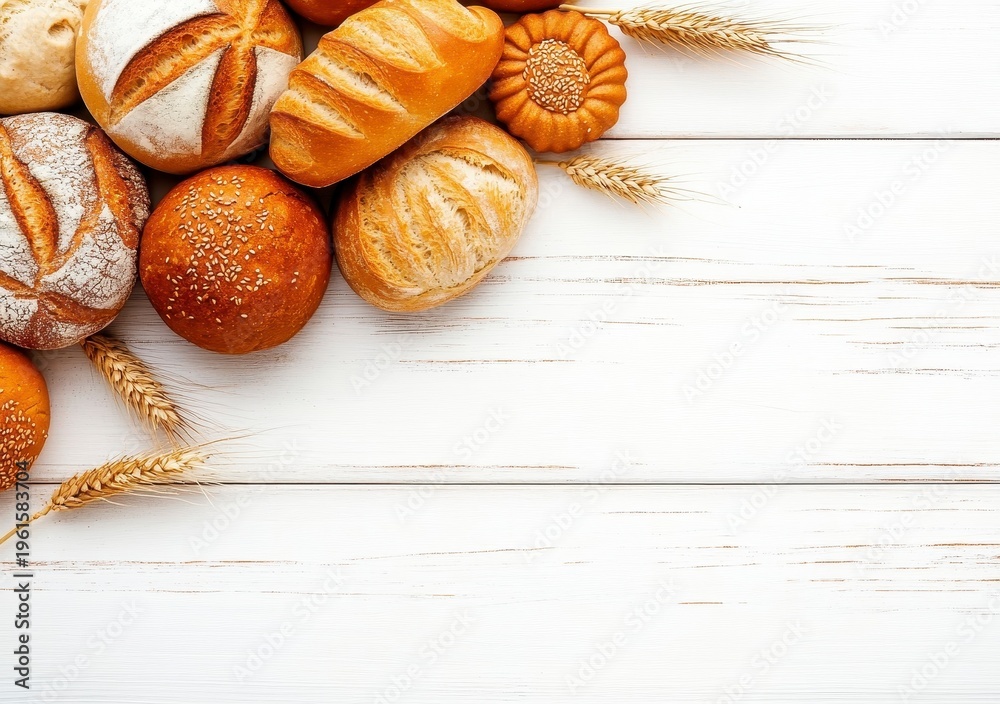 Assortment of Golden Brown Breads on White Wooden Background Wallpaper