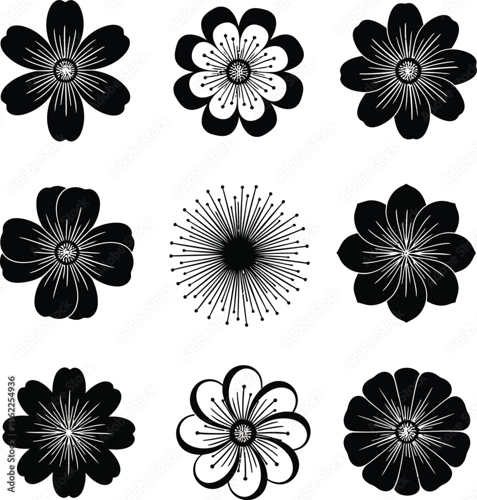 Nine Black And White Stylized Floral On White Wallpaper Mural - Decorly Solutions | Decorly Solutions