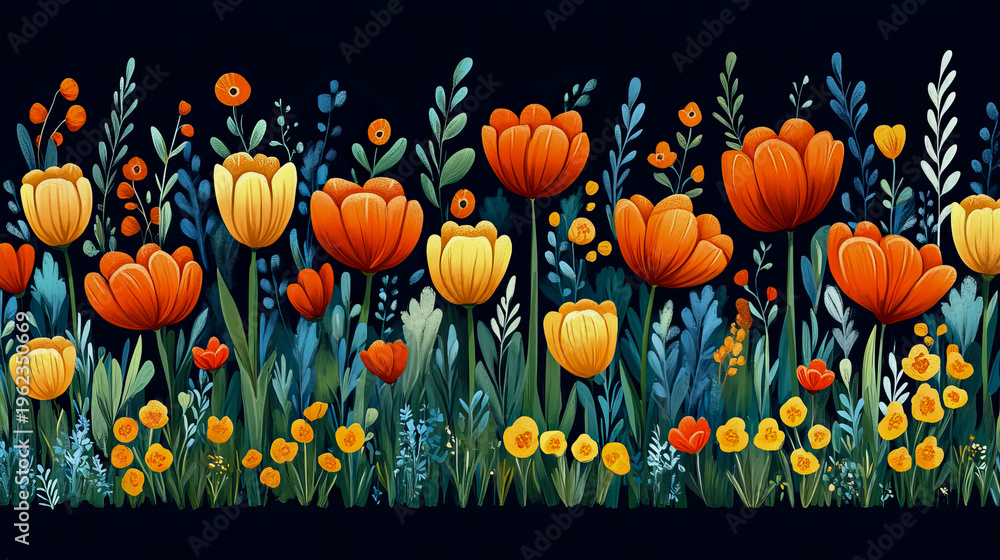 Vibrant And Whimsical Garden Border Featuring Stylized Orange Wallpaper Mural - Decorly Solutions | Decorly Solutions