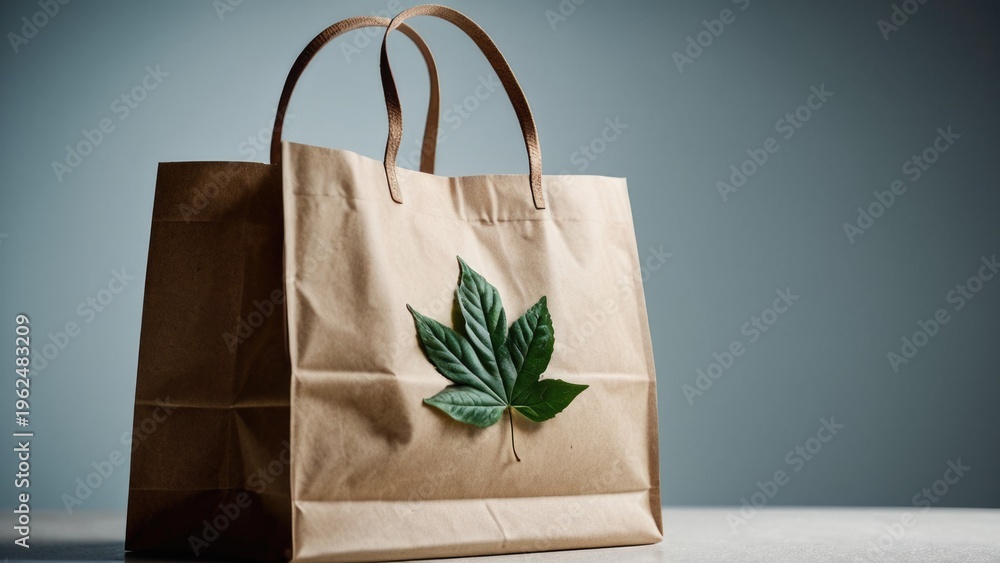 Recyclable Paper Shopping Bag With Green Leaf Design Placed on Light Background in a Well-Lit Indoor Space