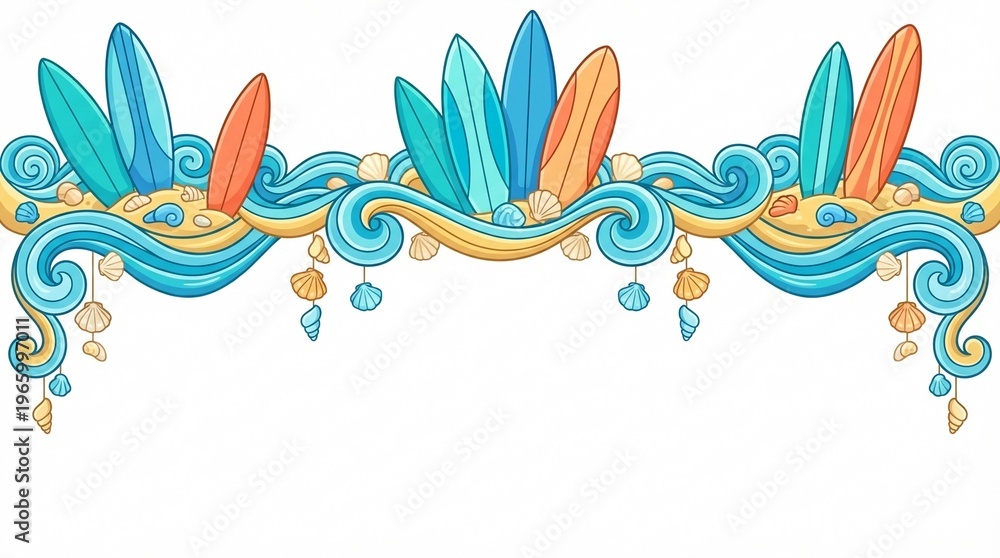 Summer Surfboard And Ocean Wave Decorative Border Illustration Wallpaper Mural - Decorly Solutions | Decorly Solutions