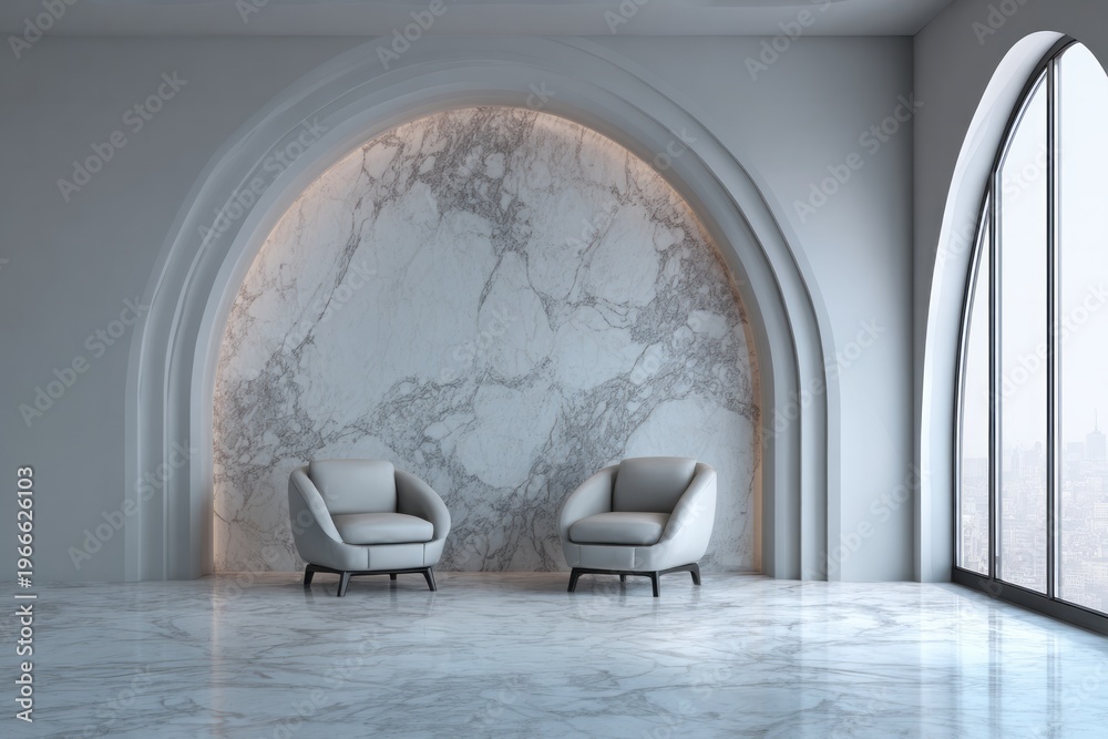 Two modern armchairs are placed in a minimalist interior wit Wallpaper