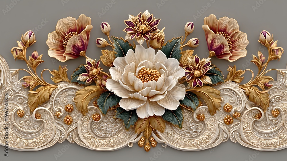 Elegant White Floral Ornament With Golden Botanical Details Wallpaper Mural - Decorly Solutions | Decorly Solutions