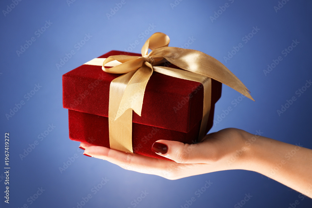 Woman holding beautiful gift box against blue background clo Wallpaper