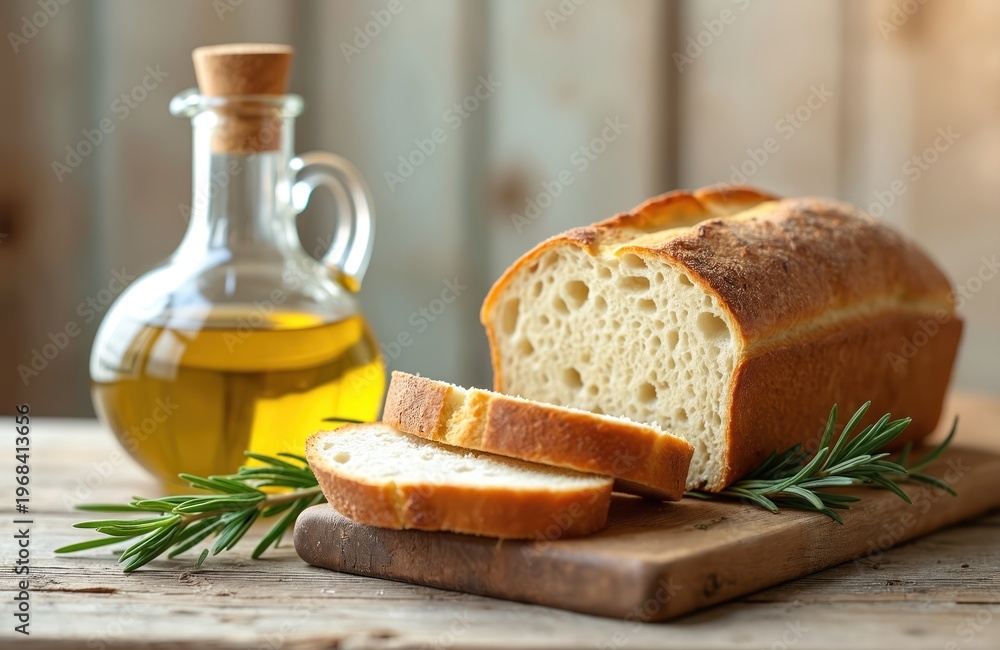 Freshly baked crusty loaf of bread sits on rustic wooden board. Slices of bread arranged next to. Jug of olive oil, bowl of sea salt also displayed on board. Rosemary sprigs add touch of natural