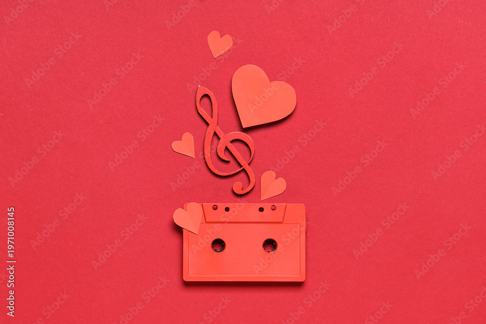 Audio cassette with treble clef and paper hearts on red back Wallpaper