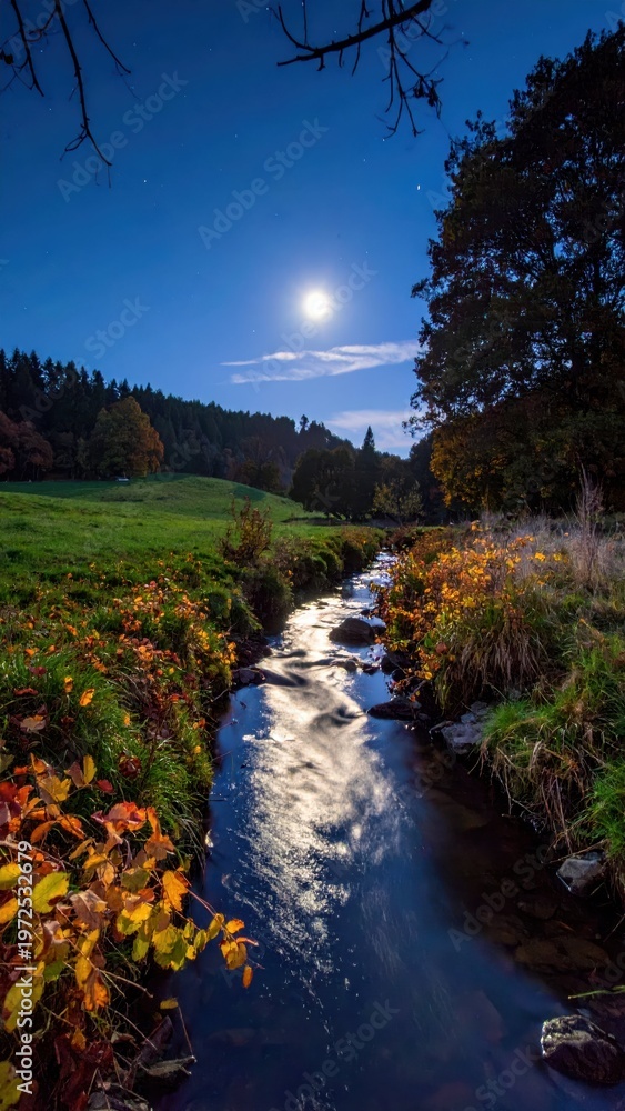 Serene Moonlit Stream Flowing Through Autumn Landscape At Wallpaper Mural - Decorly Solutions | Decorly Solutions